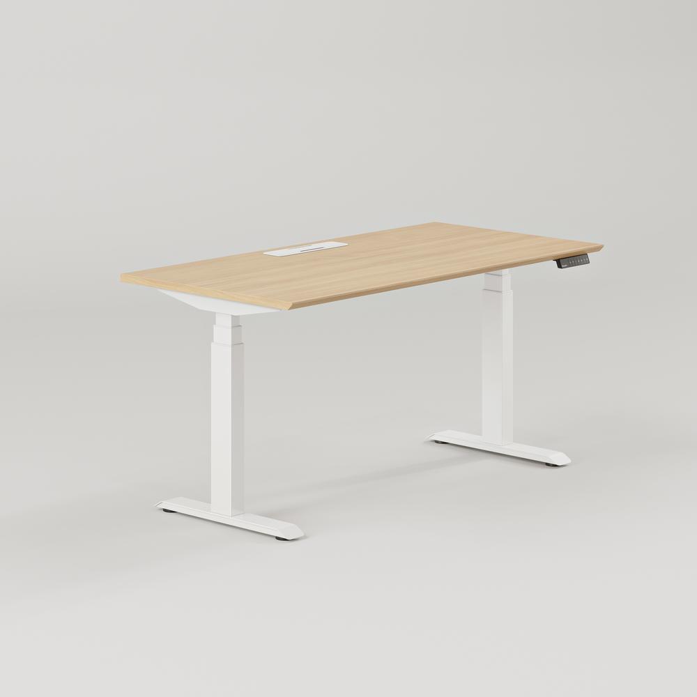 This fixed height standing desk comes in three sizes and has a 25mm top and slabs. It has a 550mm high modesty panel in the centre and comes in beech, white, walnut, and light oak.